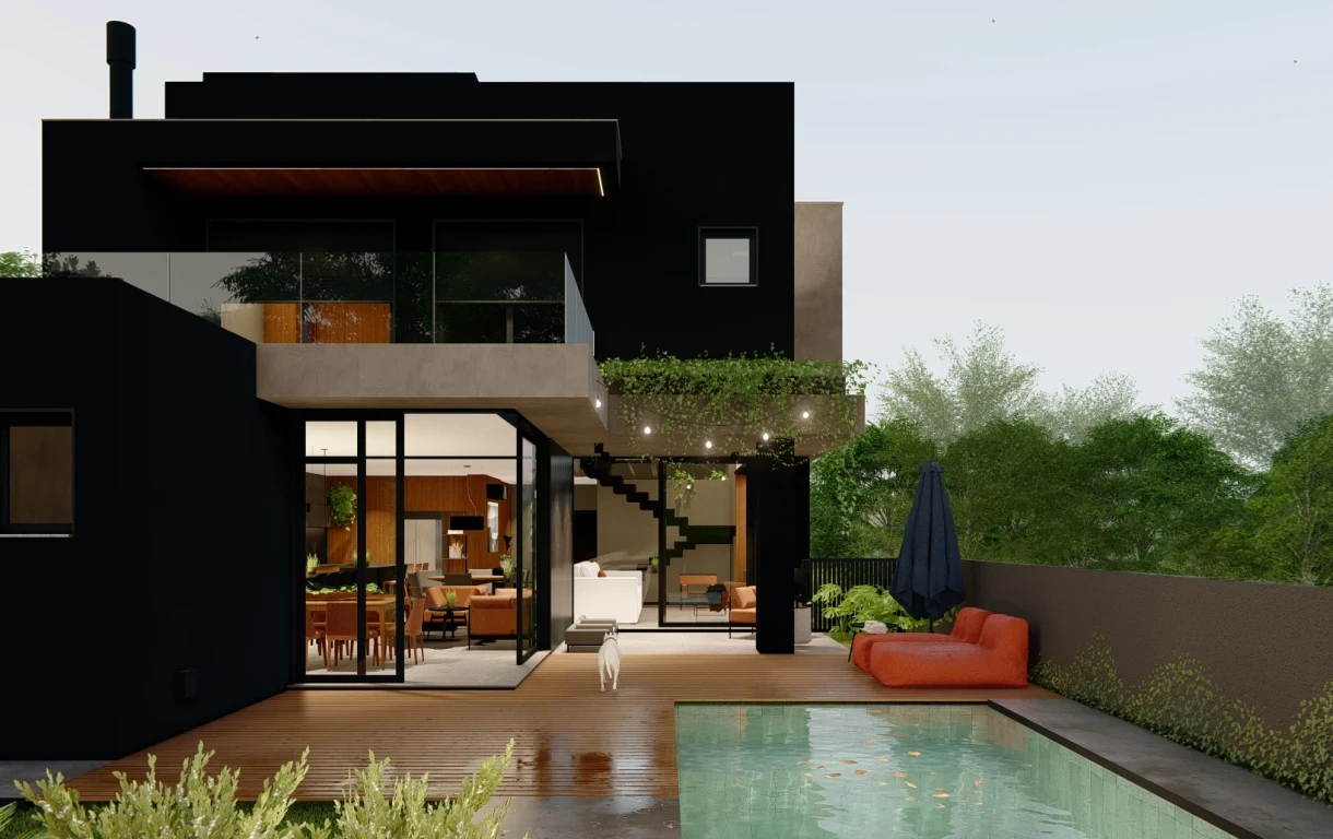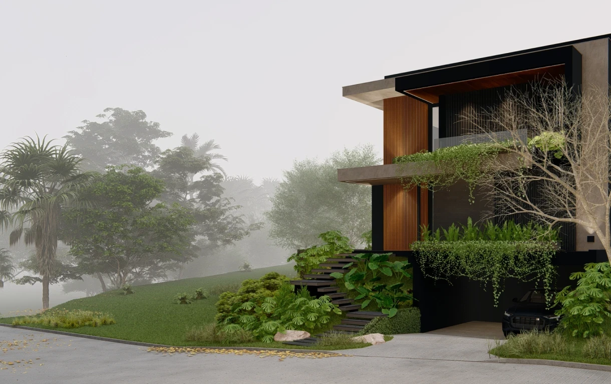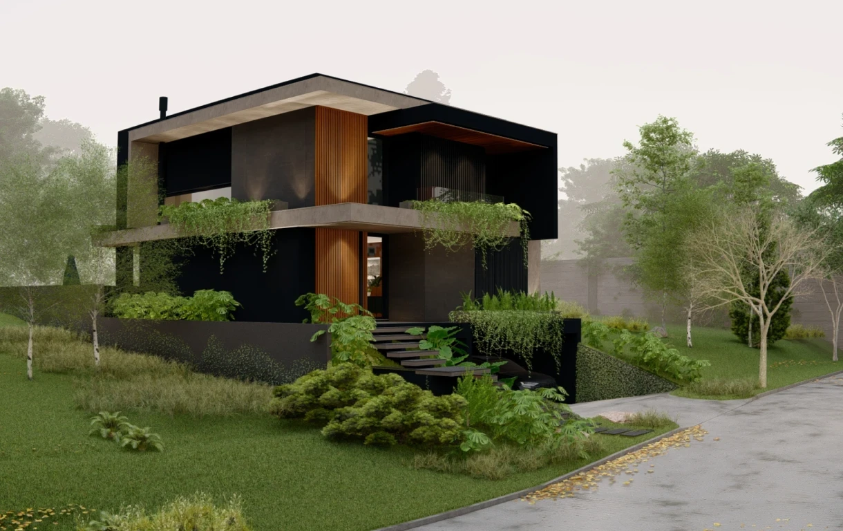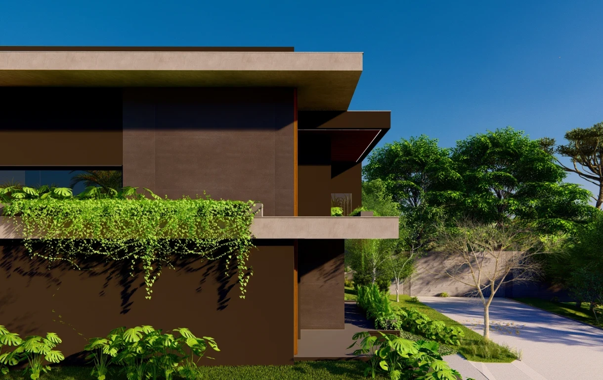 Imponente, ela é capaz de transmitir uma arquitetura contemporânea marcada pelo uso de materiais nobres e sofisticados. A volumetria sólida, composta por blocos retangulares e linhas bem definidas, revela a modernidade, enquanto o contraste entre o preto e o concreto aparente reforça a estética urbana.